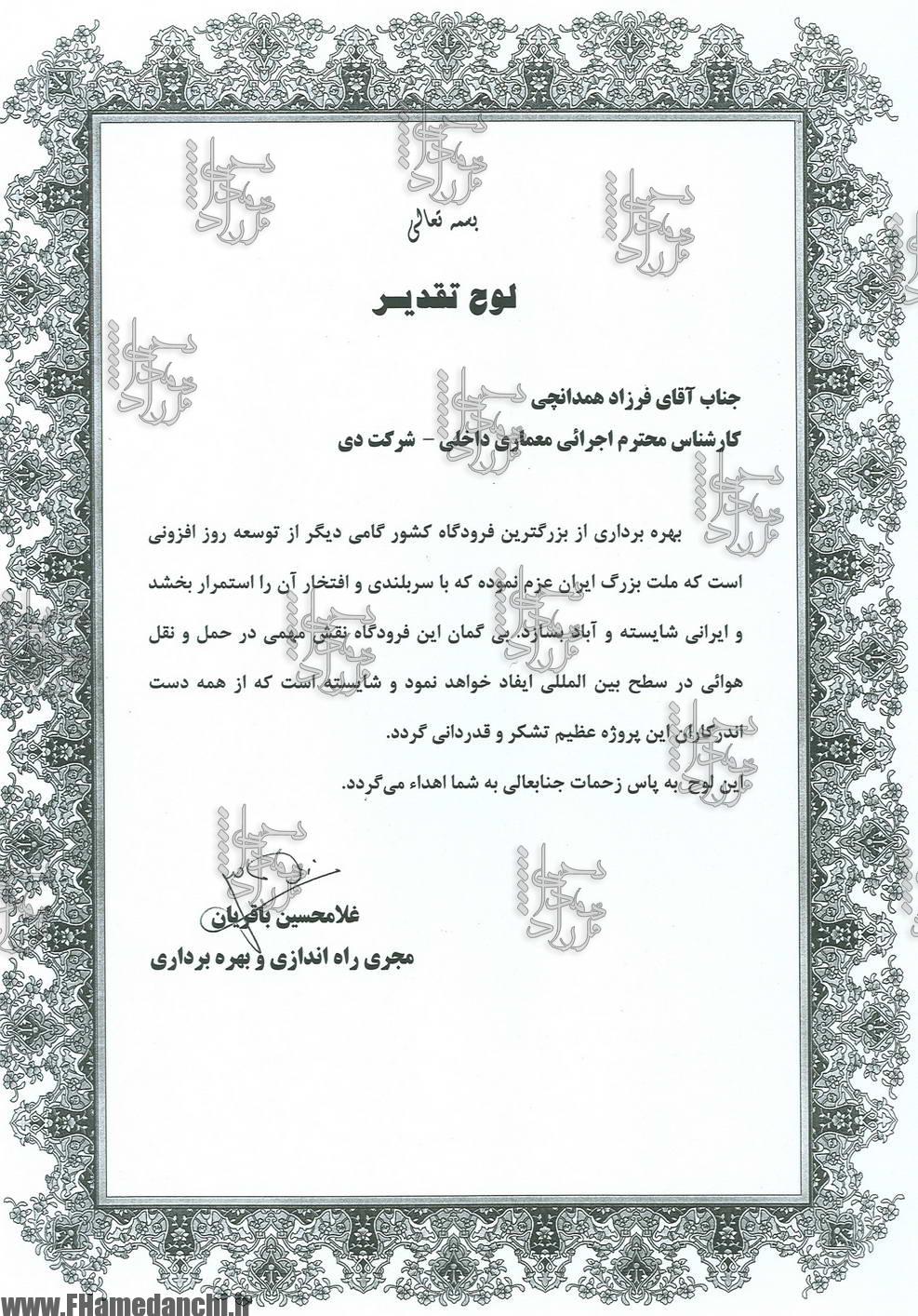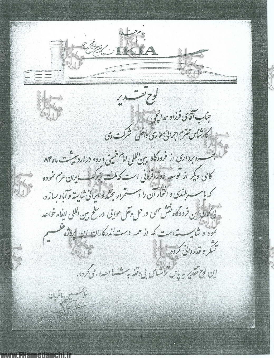 پروژه فرودگاه امام(ره) 2/84 لوح تقدیر (مجری طرح)